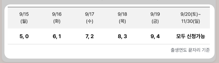 - 신청 첫 주 5부제: 원활한 신청을 위해 첫 주(9/15~9/19)에는 출생연도 끝자리에 따라 5부제를 시행하니 아래 표를 꼭 확인하세요! 9월 20일(토)부터는 누구나 신청할 수 있습니다.