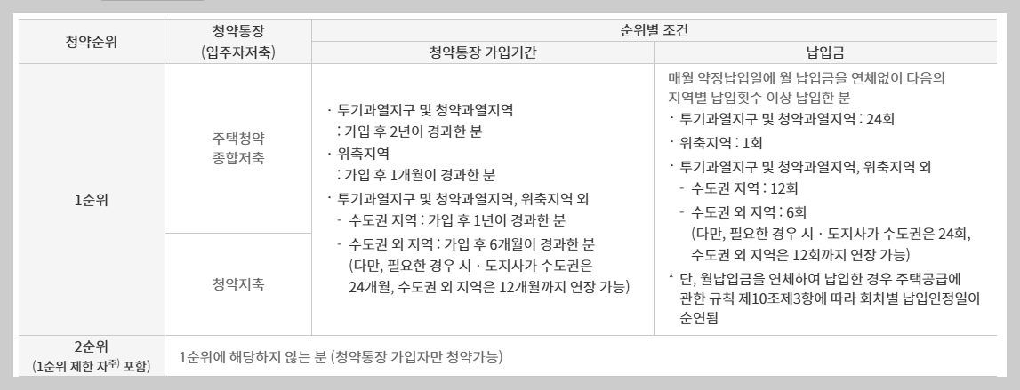 | 투기과열지구 및 청약과열지역 | 2년 경과 | 24회 이상 납입 |